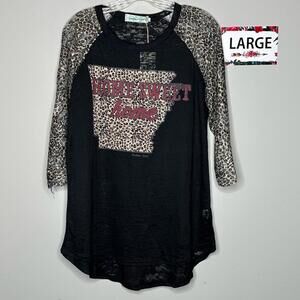 Embrace your southern roots with this stylish Southern Grace top! Featuring a flattering black body with playful leopard print sleeves, this shirt showcases the iconic 'HOME SWEET home' design against a leopard-patterned Arkansas state outline. The lightweight fabric ensures all-day comfort, while the unique design makes it a standout piece in any wardrobe. Perfect for casual outings or cozy nights in, this top combines comfort with a trendy vibe.