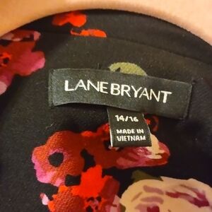 Elegant Lane Bryant blazer with vibrant floral pattern. Features pink and red flowers on a black base. Ideal for a chic look.