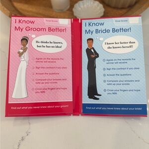 Set includes two unused wedding planners and a Bride & Groom Challenge game. Also included is a Bride to Be sash in champagne glitter color. Used but still in amazing condition. Perfect for wedding preparation. Smoke free home.