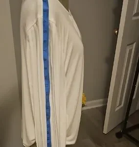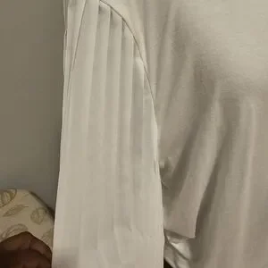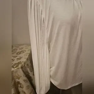 Please see pictures for measurements. The Elegant cream top features stylish pleated sleeves, perfect for any occasion. Its soft fabric ensures comfort and sophistication.