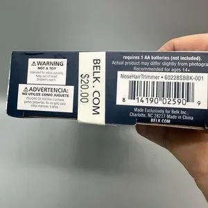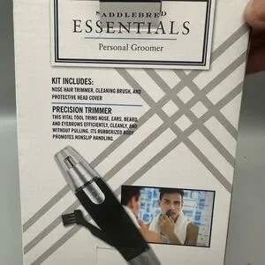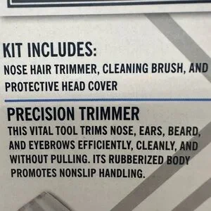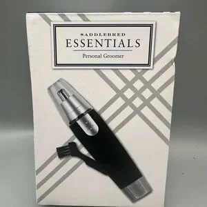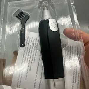Compact personal groomer with black and silver design. Includes nose hair trimmer and cleaning brush. Rubberized body for non-slip handling.