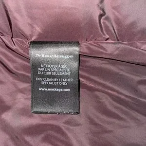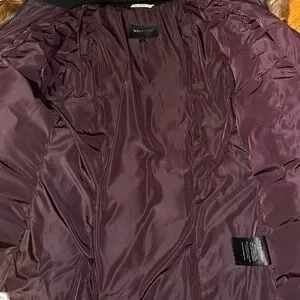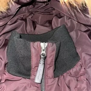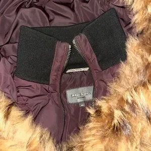 Mackage natural fur collar trim coat. Extremely warm! However, it does have imperfections as shown in photo, small tear near inner zipper (fixable) and a stain on the right side from purse friction (probably washable, I haven’t attempted, thus the price) full fox fur, it’s NOT skimpy as seen on some discount coats, it’s full, bounces nicely & flowy when you walk.