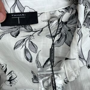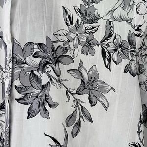 Stylish button-up shirt with a black floral pattern on a white background. Perfect for casual or formal occasions.
