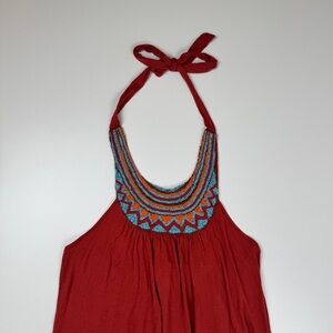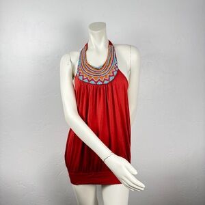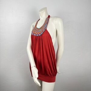 Vintage Y2K Twenty One Beaded Halter Top Micro Mini Dress Size Small Boho Fairy Western Tribal Indie Cottage Rustic Brick Orange With Blue & Orange Beading Details hi