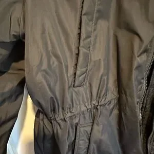 Gently Used black parka jacket by The Gap . Ideal for chilly days. Features a comfortable fit with adjustable waist strings in the interior, 4 exterior pockets and a faux fur trimmed hood.