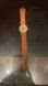 Elegant watch with brown leather strap. Features signature logo on dial.