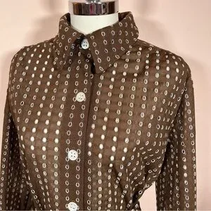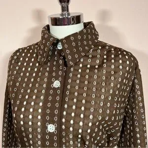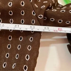 Beautiful deep coffee brown with sweet eyelet lace open work trimmed in a cream colored thread on a mid century modern belted tunic button down. Flattering design with long sleeves, rounded high collar, contrasting button front and a matching belt with string belt loops. Easy poets blouse style with a generous gathered yoke for plenty of room.