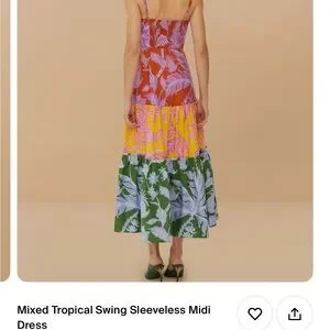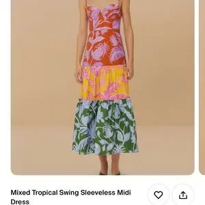 Vibrant sleeveless midi dress with tropical patterns. Features bold red, yellow, and green sections. Perfect for lively outings.
