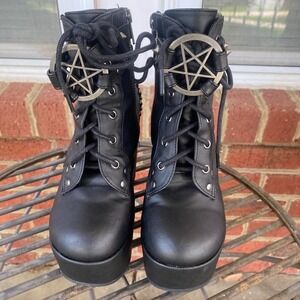 * Up for sale is a -Poison 101 Demonia Boots Women 6 Black Goth Punk Studs Spikes Witchy. Very edgy. Zipper closure/laces and hook and loops on the straps around the ankle. The chains for the metal loops are missing. Features a pentagon star.