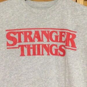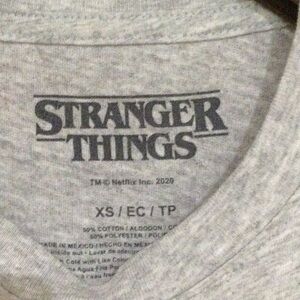 Embrace your love for Stranger Things with this stylish gray short sleeve tee. Perfect for casual outings, this comfortable top is a must-have for fans. Gently used ,no flaws Fabric: 50% cotton, 50% polyester.
