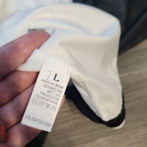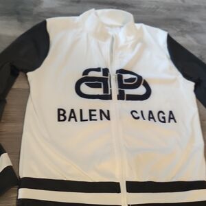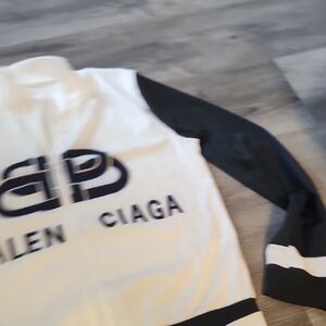Chic Black and White jacket with bold logo. Features black sleeves and white body. Zip up closure.