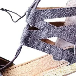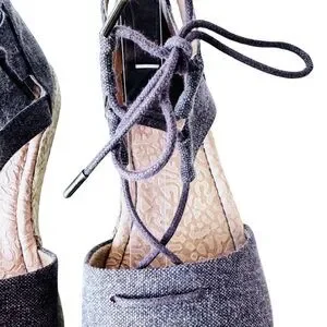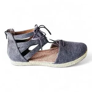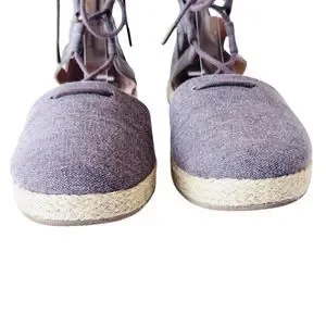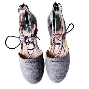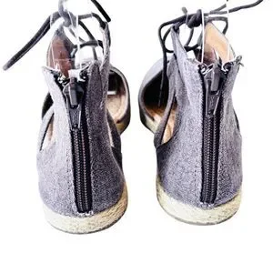 Nice gladiator style shoe in brownish gray canvas with jute espadrille trim on edge of soles. Closed toe design and 1/2" sole/flat heel. The shoes have lacing for adjustability with a back zipper for ease in access. Cushioned insoles. In nearly new condition. Ships from smoke and pet free home.