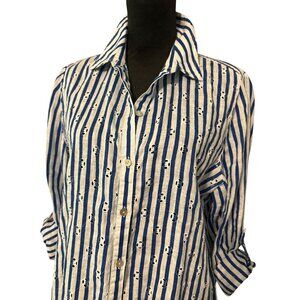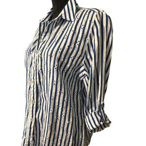 This unique button-up shirt combines classic blue and white stripes with playful embroidered details, adding charm and character. Crafted by Chico's, it features a lightweight fabric for comfortable wear and roll-tab sleeves for versatile styling. With its tailored design and eye-catching pattern, this piece is a statement in casual sophistication.