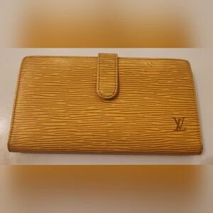 Striking color combination on this beautiful Louis Vuitton Epi Continental Viennois wallet! Tassilli yellow with purple.