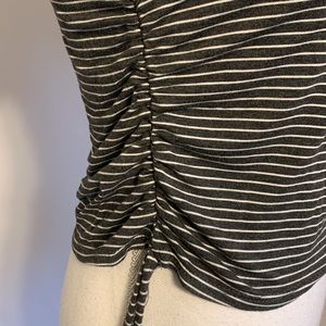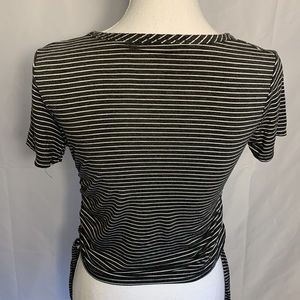 Junior size medium. Rich and Bree T-shirt. Gray striped. Ruched sides. Bottom ties. Very stretchy. Chest measures 32 inches. Shirt length is 19 inches. 117/24.