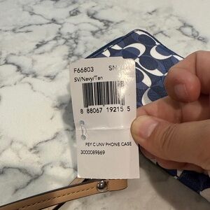 Elegant Coach wristlet with iconic pattern. Features a leather strap and metal logo accent.