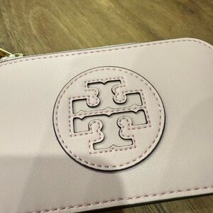 Can be used as a wristlet with the attached strap. Elegant Tory Burch card holder in blush pink. Features iconic logo and sleek design. Ideal for essentials.