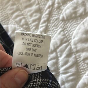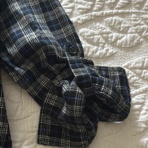 Stylish and comfortable women’s flannel tunic. Perfect for casual outings paired with skinny jeans or leggings. Arms can be styled two ways: long sleeved, or pulled up and buttoned with tab. The base color is black with a grey, white, and blue running through it. It is a size medium. The tag somehow melted when I ironed but no damage to the actual shirt! Be aware the top does not button all the way to neck, a slight V is at top.