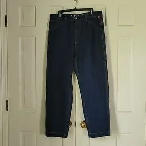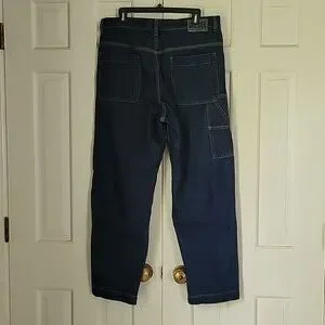 dark wash men's Carpenter Jeans featuring coca cola. zip fly. great pre-owned condition. waist is approx 17" flatlay, rise is approx 13", inseam is approx 29".