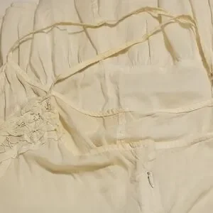 Vintage cream cami top with lace trim. Features a ruffled hem, side zipper, and adjustable straps.