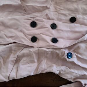 Stylish pink blazer with double-breasted design. Features black buttons and front pockets. Ideal for a polished look.
