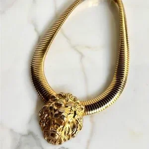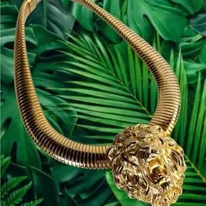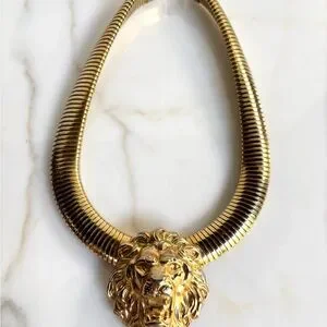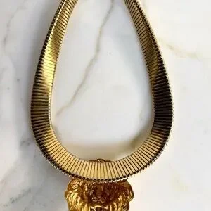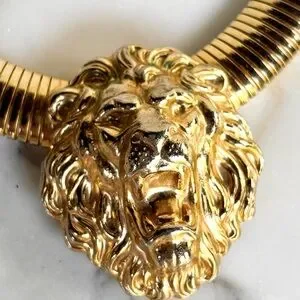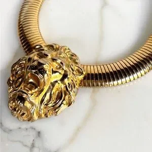 An original 1980s gorgeous piece of vintage FABULOUSNESS statement necklace like no other! To wear alone or layer with other necklaces. A bold, massive 80s tubogas omega flexible collar necklace is crowned with a regal lion’s head, mane and all. It’s giving major 1980s Bulgari and Versace vibes!