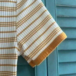 Casual tee with mustard and white stripes. Soft ribbed fabric. Perfect for everyday wear.