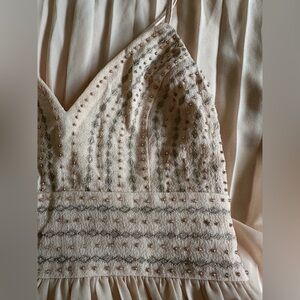 Lulus midi dress size small V-neck peach color with embroidery and stones sewn on the front, adjustable straps crisscrossed in the back, pleated skirt, and the fabric is not elastic, used only once for a wedding, in excellent condition as seen in the photos, see measurements and materials in photos.