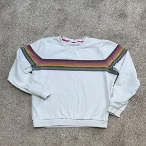 Stylish cream sweatshirt with colorful rainbow stripes. Soft and cozy material. Perfect for everyday comfort.