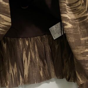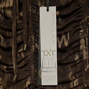 Chic brown blouse with unique pattern. Semi sheer long sleeve and ruffled front. Perfect for stylish outings.