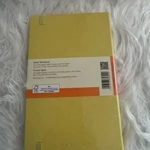 Yellow Moleskine notebook with fabric cover. Includes elastic band closure.