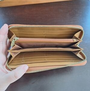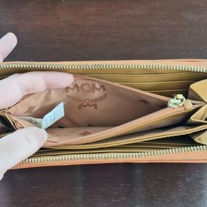 Elegant MCM long wallet with tan and pink design. Features iconic logo pattern. Some minor wear on the hardware and some light rubbing on the inside, but in generally good condition.