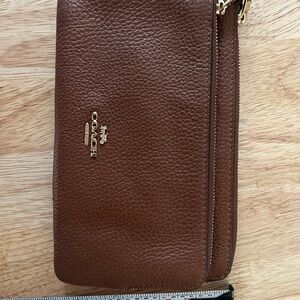 Chic Coach wristlet in tan leather. Features a convenient wrist strap and secure zipper closure. 2 pockets, smoke free home.