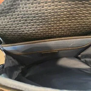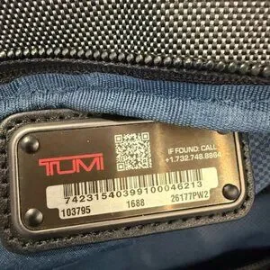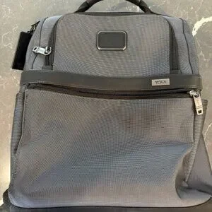 Black and grey Tumi back pack. Great for work and travel. Easily slides onto suitcase handle. Sleek design.