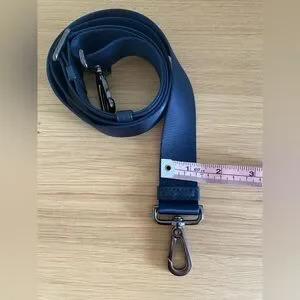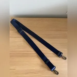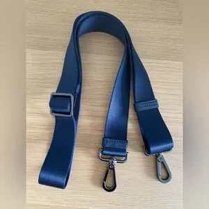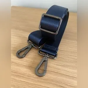 New bag strap in navy blue nylon that has nice sheen to it per photos, with leather detail and metal hardware
