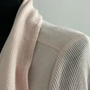 Practical, stylish, and casual are all wrapped up in this palest of pinks, multi-fabric knit drape cardigan or shrug (mostly cotton); long sleeved and fleece-like underside.