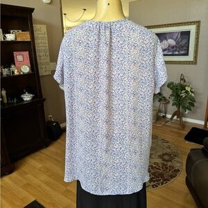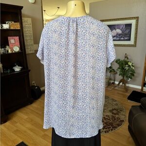 Carolina Belle delicate purple, blue & white floral ruffle sleeves Vneck blouse. 3 buttons under Vneck. Size 1X. Armpit to armpit is 25 inches, length is 27 inches. Material is 100% polyester. In new condition.