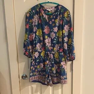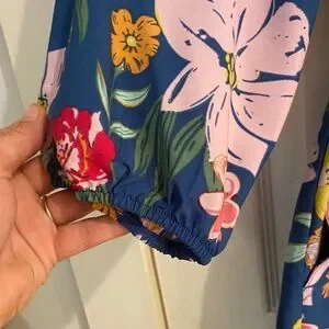 Elegant romper with vibrant floral design. Features blue, pink, and yellow hues. Pockets!!