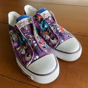 Laceless purple grafitti slipon low tops.
