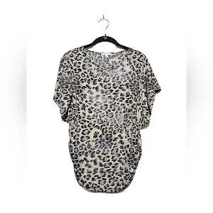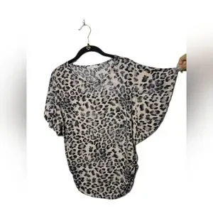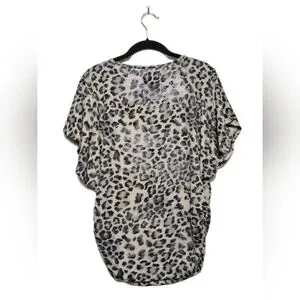 Stylish animal leopard print blouse by Moa Moa. High stretch material, oversized, comfy, soft material, dolman sleeves, elastic near hips with a ruched material. This large leopard animal print top features a black, grey and cream pattern with silver sparkle shine in the material (not loose glitter). This Moa Moa Top is perfect for casual or dressy occasions.