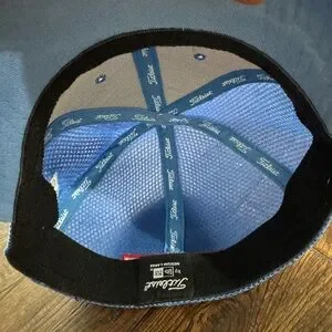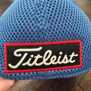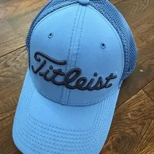 Light to medium blue color cap with mesh back. Features embroidered Titleist logo. Mens size medium or large. Good condition. Note wear as shown on bottom of hat bill. Titleist by New Era.