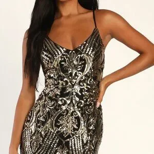 Make the greatest entrance of the night in the Lulus Truly Alluring Black and Gold Sequin Mermaid Maxi Dress! Eye-catching gold sequins dance across a black mesh overlay (atop a knit lining) as they shape an elegant V-neckline and a fitted bodice, all supported by adjustable spaghetti straps. The figure-hugging waist falls to a stunning mermaid skirt that ends at a maxi hem. Hidden back zipper/clasp.