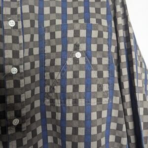 Style: long sleeve, collared, check plaid pattern, button cuffs, front pocket with triangle seam detail, vintage, 70's