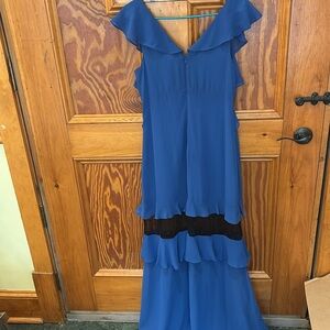 Chic blue maxi dress with elegant ruffles. Perfect for any occasion. Stylish and sophisticated design.