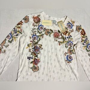 Elevate your wardrobe with this Sundance floral embroidered top. Featuring intricate multicolor floral designs on a classic white background, this top is perfect for any occasion. Enjoy the blend of style and comfort with this elegant piece.size X-Small, measure across the chest 18.5”,length 24” New with tag