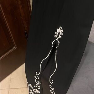 Sophisticated black dress featuring delicate white embroidery. Long sleeves add a touch of elegance.