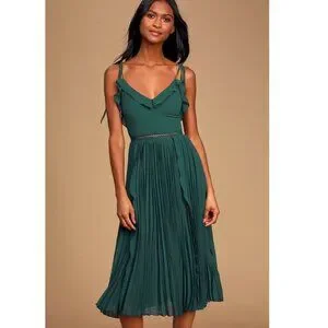Lulus Never a Dull Moment Emerald Green Tie-Strap Pleated Midi Dress! Lightweight, woven chiffon shapes this darling dress with adjustable tying straps and a ruffled, V-neckline. Darted bodice carries into a fitted waist, accented with sheer, pierced embroidery, and a pleated midi skirt with ruffled trim that trails down the sides. Hidden back zipper/clasp.