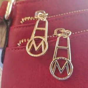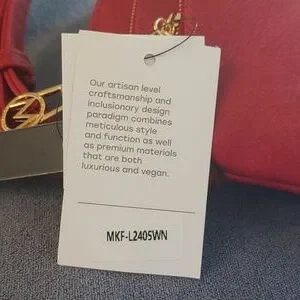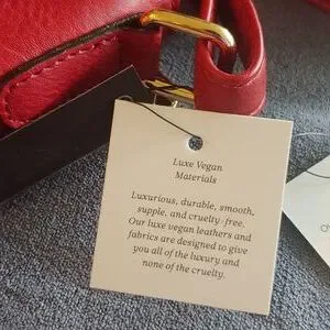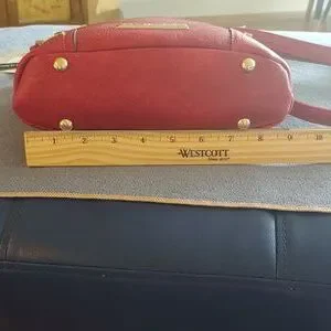 This beautiful red vegan leather handbag has goldtone hardware. There are 2 zipped pockets in the front and one zipped pocket in the back. Inside there is one zipped pocket and 2 open slip pockets. There's plenty of room in the main compartment for all your essentials. There are 4 little "feet" on the bottom of the purse so it stands up. The strap is adjustable. Measurements: 9.84" L X 9.06" H X 4.33" W