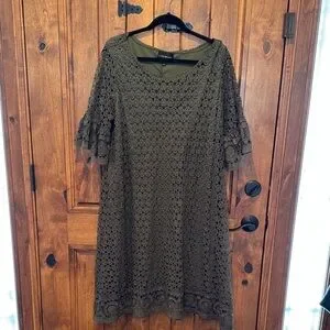 Elegant olive lace midi dress. Features intricate lace design and stylish sleeves. Ideal for any occasion.