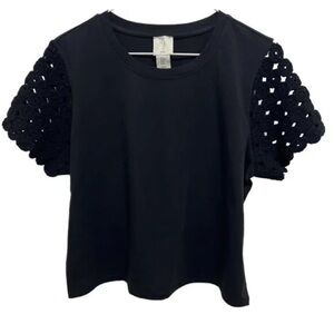 Fun black women's top featuring stylish crochet sleeves. Perfect for any occasion. PRELOVED excellent!